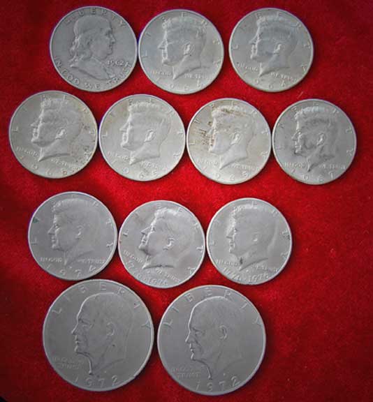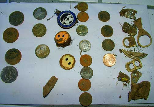 cache of mostly silver coins wrapped in cloth and a plastic