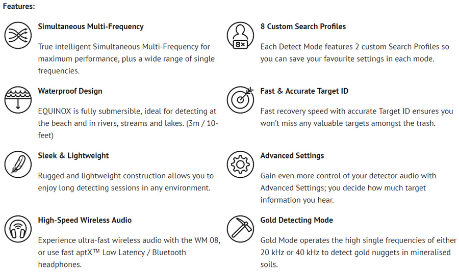 Allows you to listen to audio wirelessly for greater freedom of movement. Up to four WM 08 Modules can be connected to an EQUINOX detector for group training.